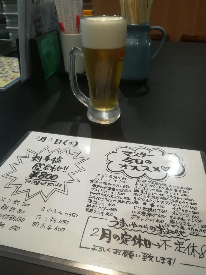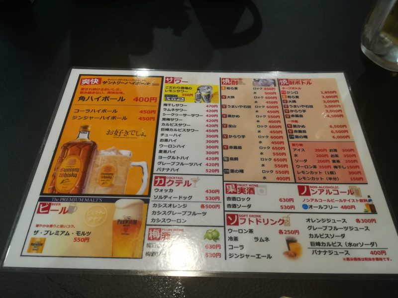 つまみ2品、酒5杯で3500円前後。なかなか安いですね