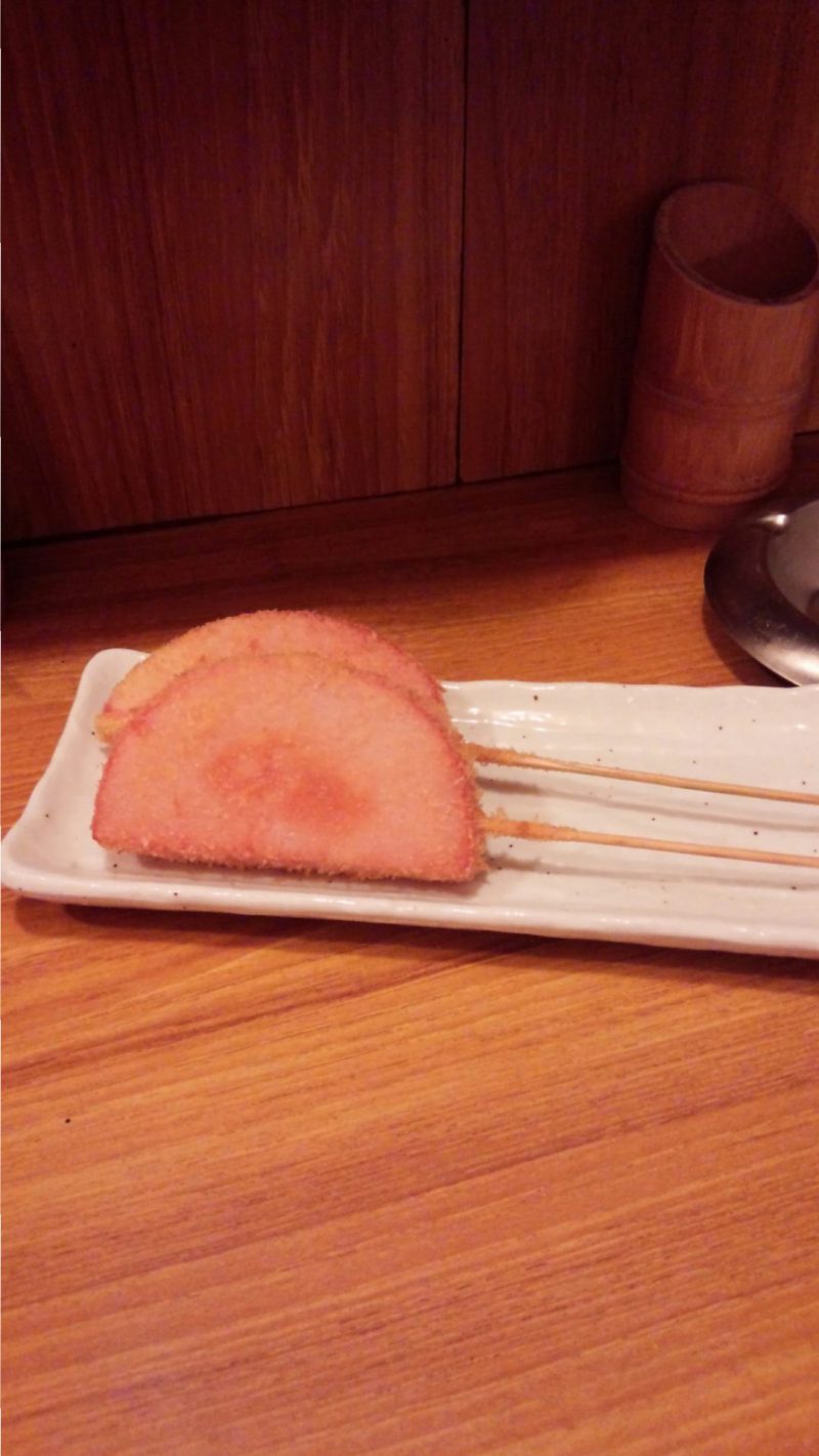 全然美味しそうに見えないけど、めっちゃ美味しかった串揚げ!とっても大きくて分厚いハムカツなんです!!写真見るとなにがなんだかわからない・・・酔っていてちゃんと写真が撮れなかったのが残念・・・