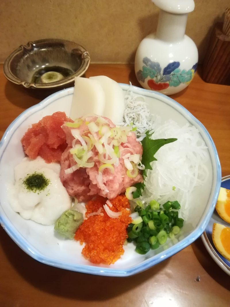 これだけでご飯2杯は食べられるネギトロ。かまぼこ2切れ、シラス、たらこ、山芋、とびっこです