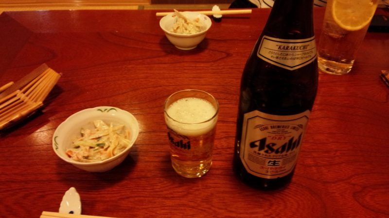 瓶ビールですね 突き出しはごぼうサラダでした