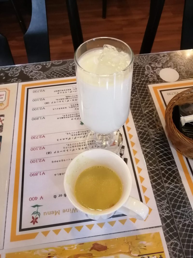 最初にスープとラッシーです。行徳に数多くのカレー屋さんがありますが、スープを出すのはここだけな気がします。このスープもカレー味ですね。美味しいです