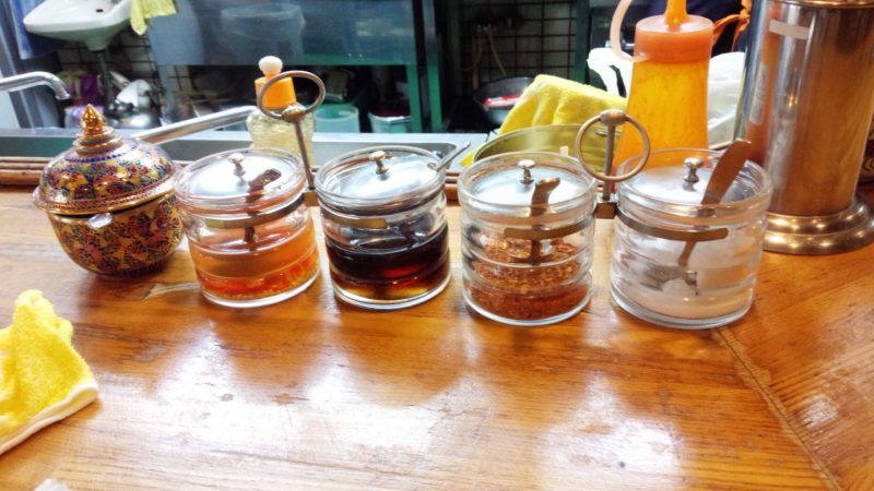 料理がくるまで周りを観察。タイ料理にはだいたい4種類の調味料がおいておあります