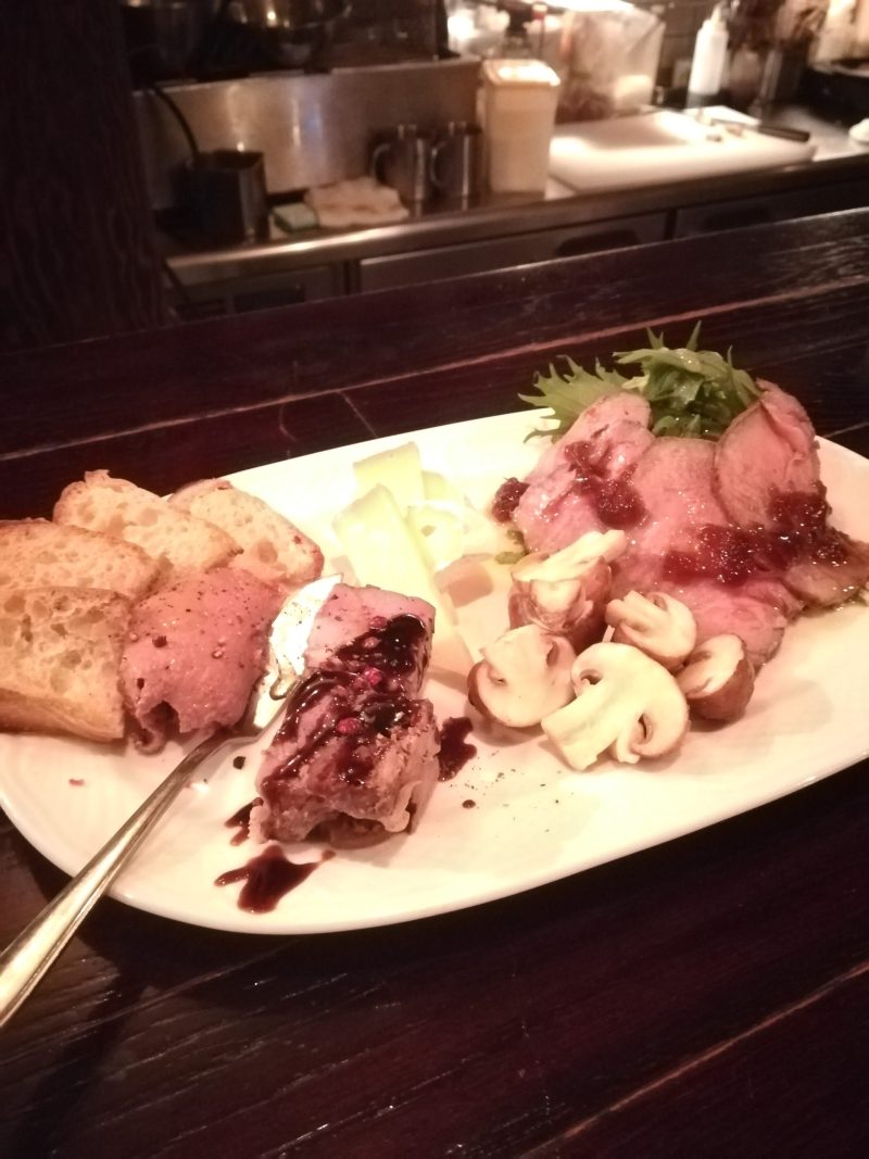 右からローストビーフ、マッシュルームのマリネ、チーズ、ピンクペッパーのかかったお肉、レバーペースト