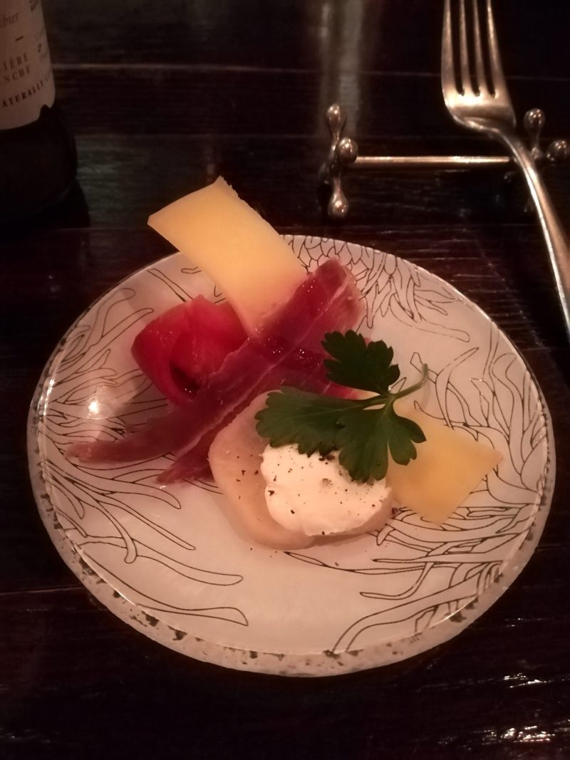 手前はいぶりがっこのクリームチーズ、奥に生ハム、チーズ、フルーツトマトとすべて味が濃くて美味しかったです