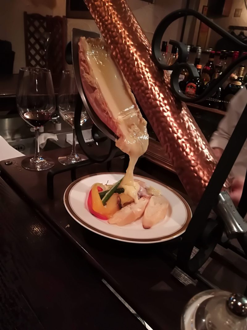 ベーコン、バケット、野菜などいろいろなものの上にラクレットチーズが乗っています