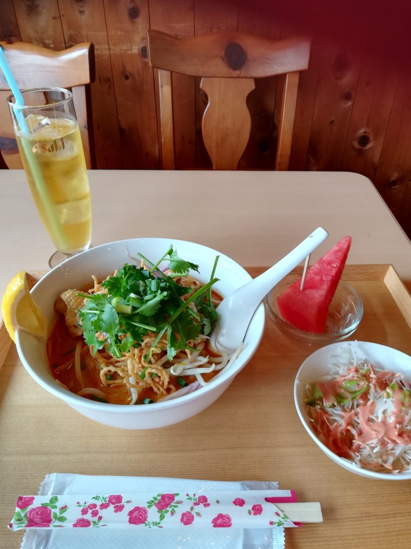 おっ食べたことのないカオソーイがあります!カレーラーメンの上に揚げた麺が飾りで乗っているくらいしか知識がないのですが、最近有名になったタイ料理で食べてみたいと思っていたのでとっても嬉しいです