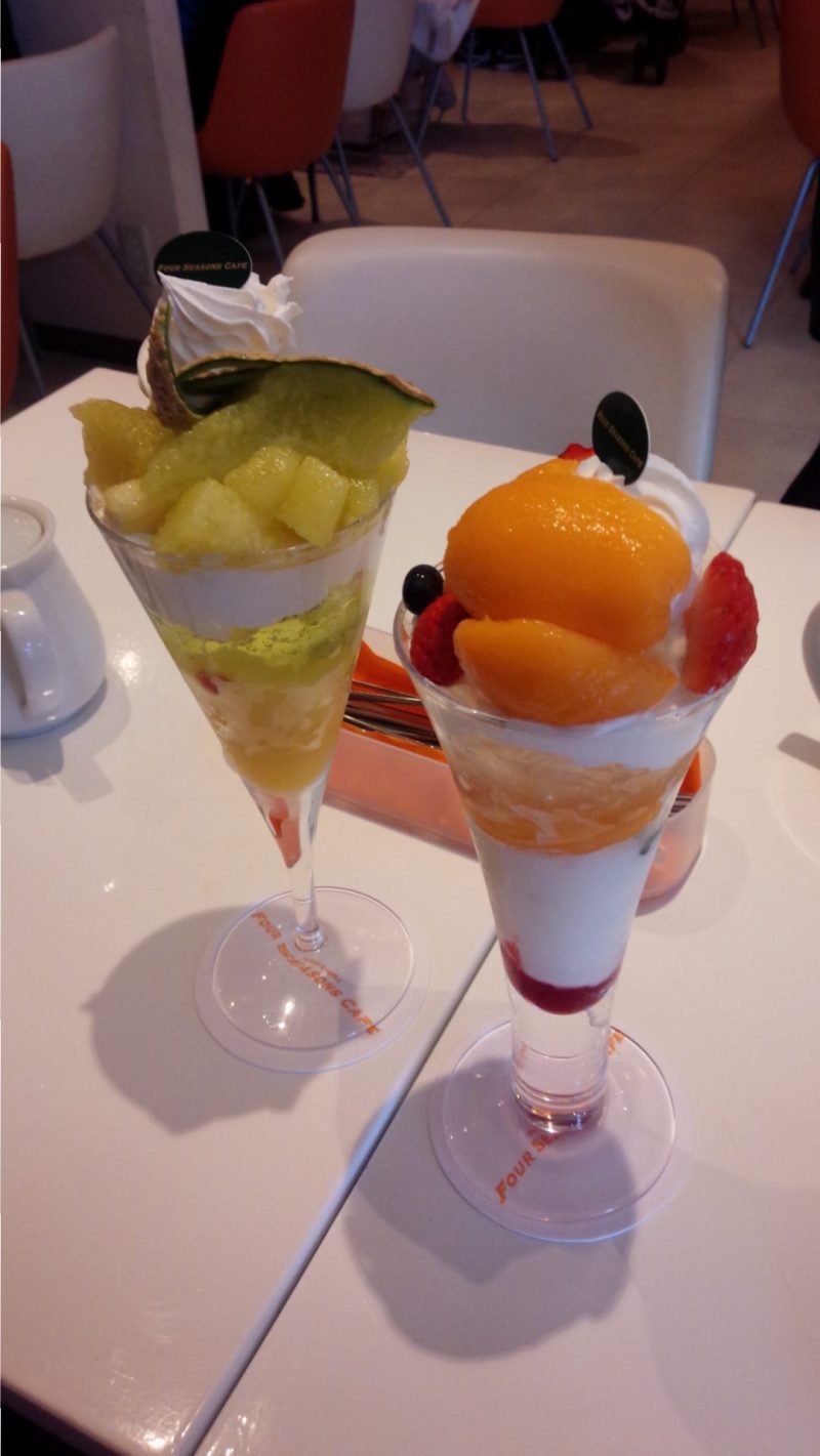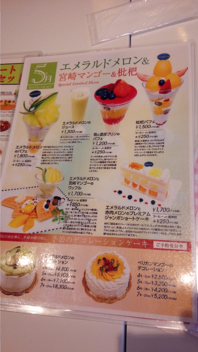 アンデスメロンのパフェ、 枇杷パフェ、 メロンと宮崎マンゴーのワッフル の3品です