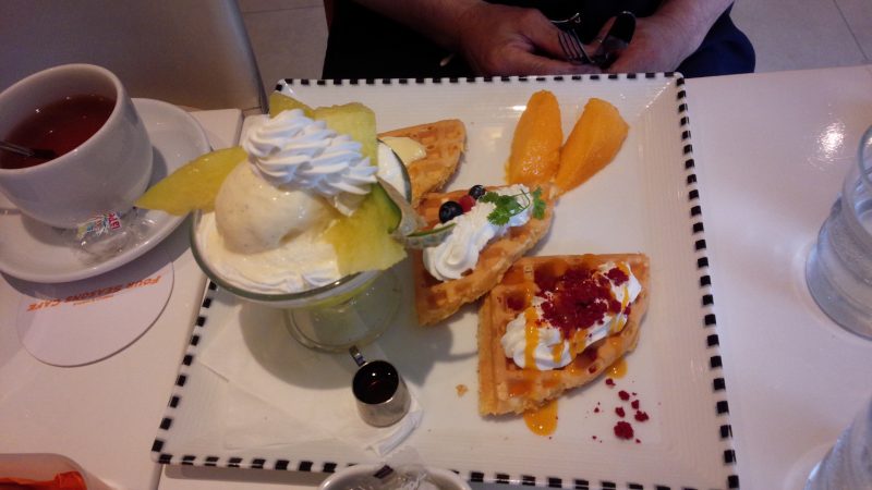 ワッフルは柔らかく、マンゴーはとっても濃厚な甘さ。さらに酸っぱいベリーの何かがワッフルの上にかかっていて甘い中に酸っぱいものがあるとリフレッシュされて甘いものがさらに進むという無限ループですね