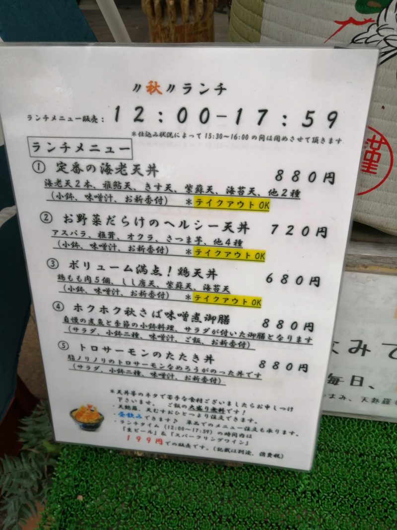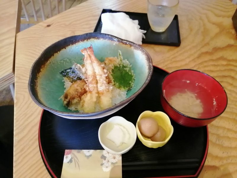 天丼の内容はエビ2つと大葉、海苔、シイタケ、玉ねぎ、鶏肉、あとはなんだっけな。。。