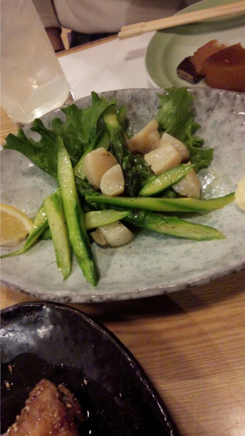 ホタテとアスパラ炒めですね。ホタテが生っぽくて美味しい!アスパラもシャキシャキに炒めてあります