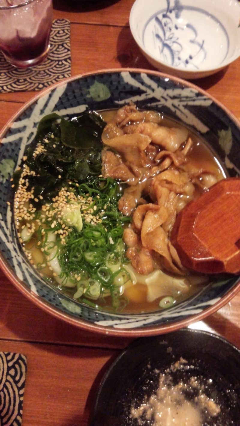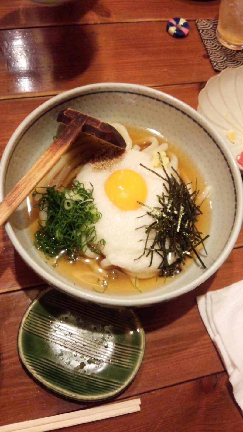 〆のうどん!「昔ながらの肉うどん」と「ひやし月見ととろろうどん」を3人でわけました