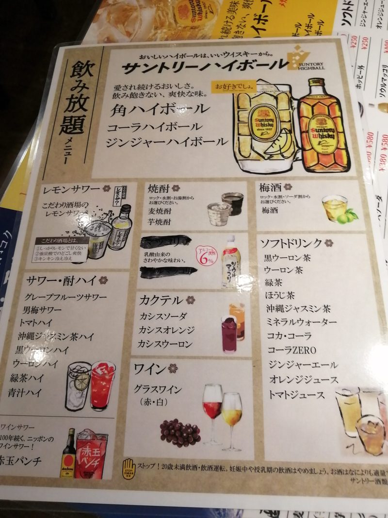 飲み放題メニュー。ビールはないとのことですが、1杯目はビールサービスのようなのでそれで!
