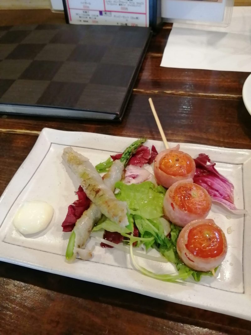 というわけで串の追加。トマト巻き220円はブシュってなって熱くないの!?と思っていたのでそれ、とアスパラ220円