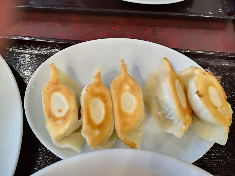餃子!やっぱり食べると肉汁があふれます!!アツアツは一口ではいけないので、少し冷めたものを一口で食べるのも美味しい!アツアツのまま肉汁をたらして食べるのも美味しい!やっぱり美味しいなあ