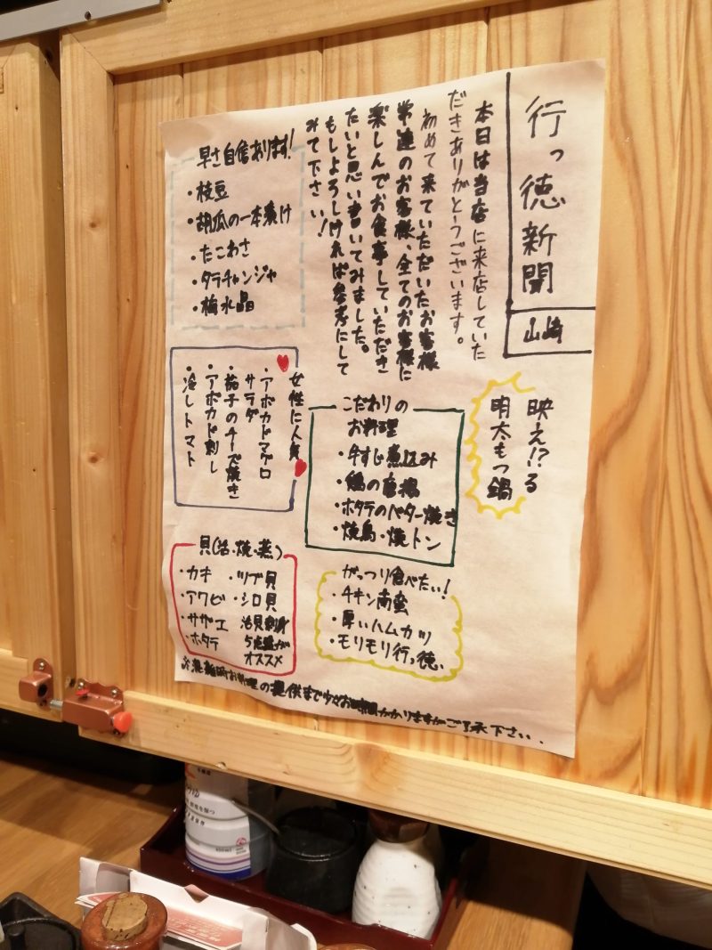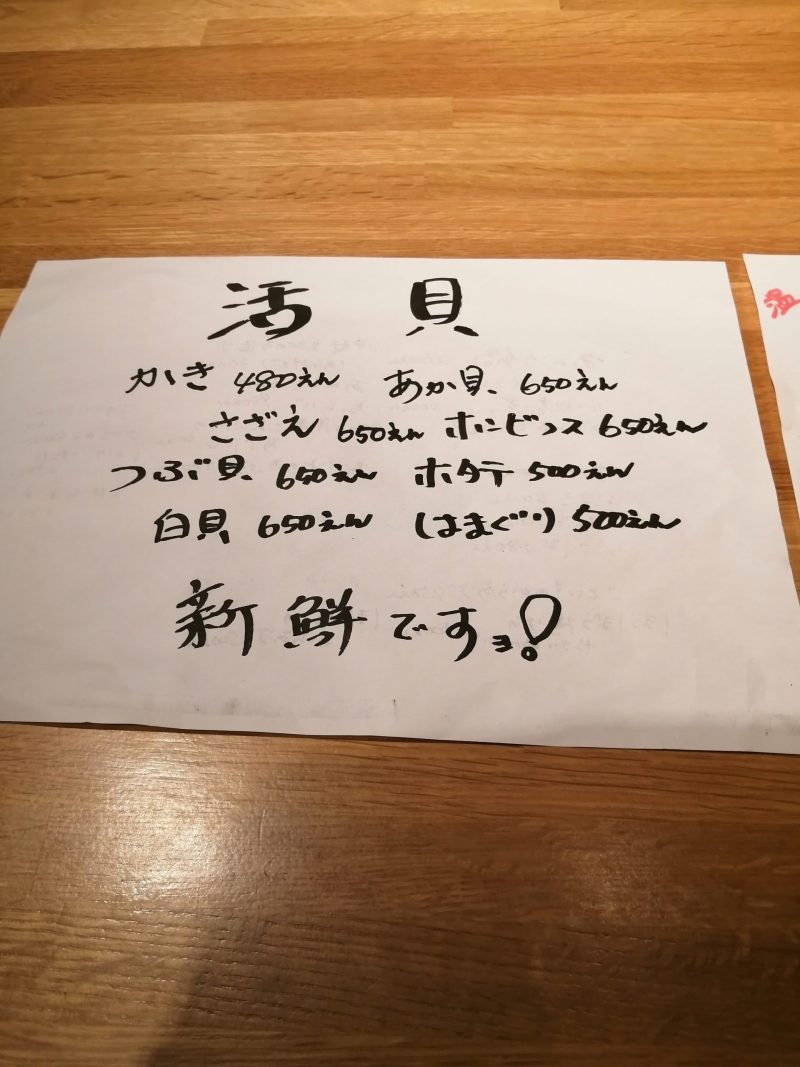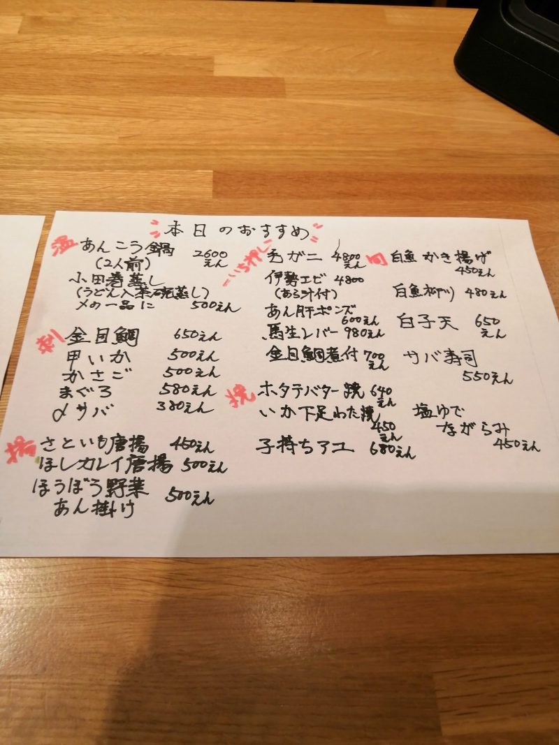今日のおすすめがテーブルにあります。手書きですね。味があります