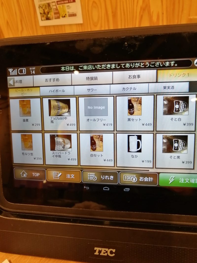 最初の1杯は店員さんに口頭で聞かれたので「ビールで!」