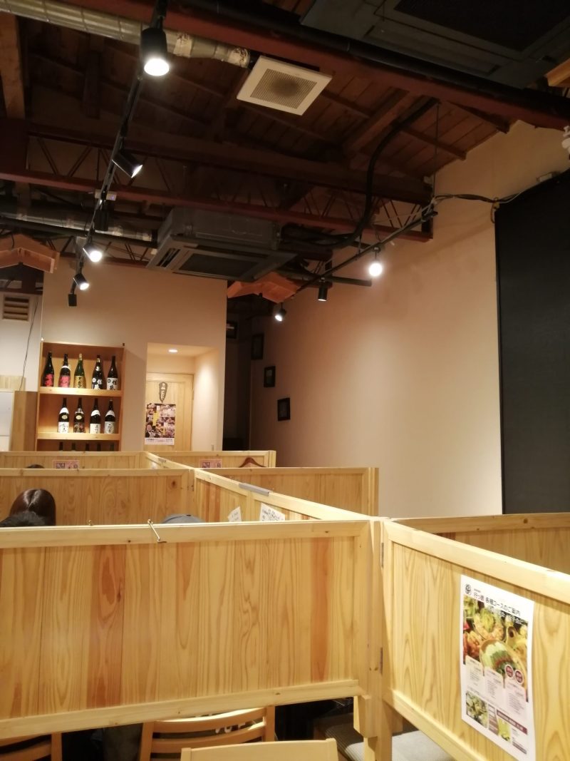 真ん中にテーブル席が6つあり、壁側に個室が6つほどあります。あとでHPを見ると2階で20人以上の宴会もできるようです。広い店内ですね