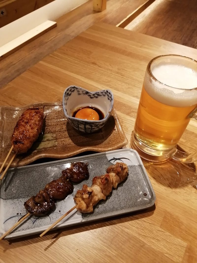 頼んでいた焼き鳥もサラダと同時にきます。つくねとハツはおいしかったです。ぼんじりは今まで食べたことのない形をしていて、いつも以上にガリガリしていてちょっとおもしろかったです