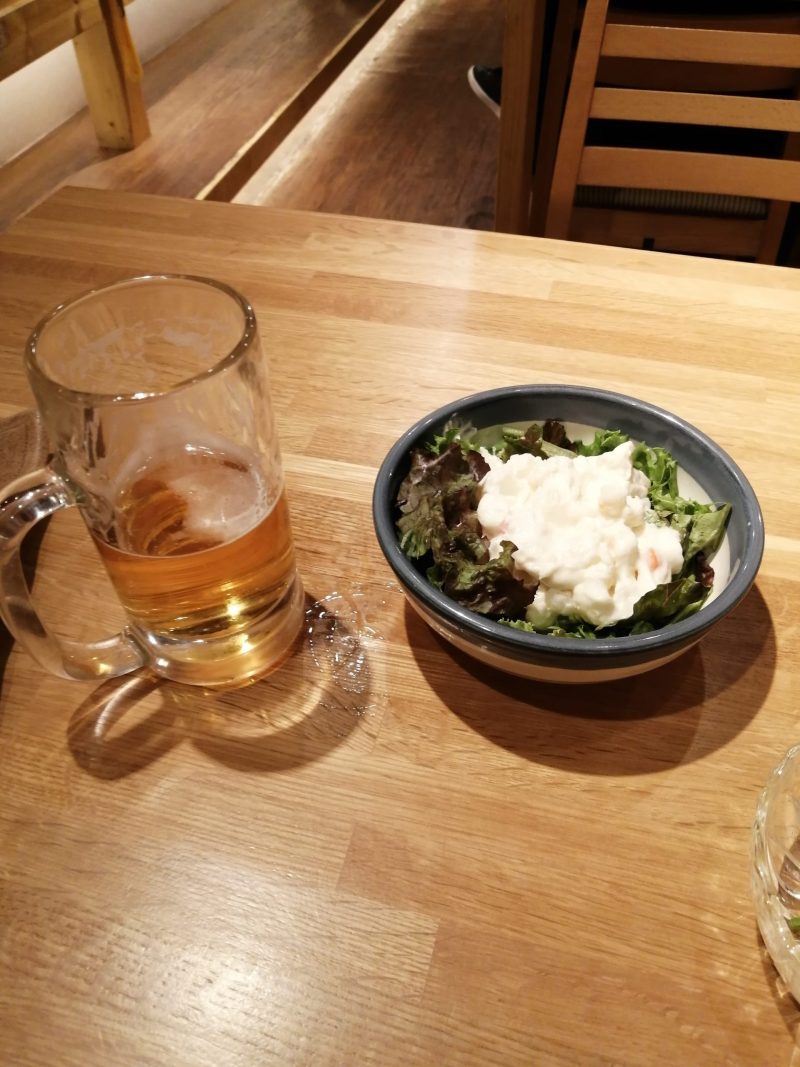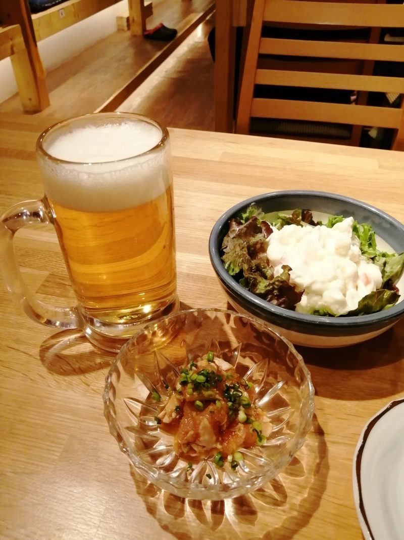 つまみが一気に来るとビールもなくなりました。追加でビールでもいいけど、そんなにおいしくないし、発泡酒の方が100円安いからそっちにしようかな