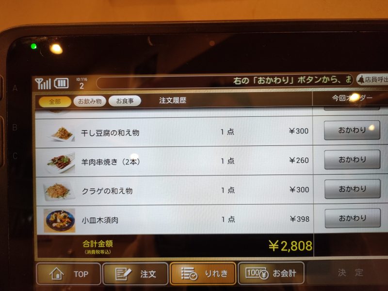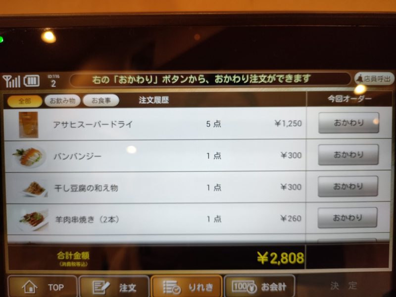 合計ビール5杯、つまみ5品で3000円いかない!これはいいコスパですね