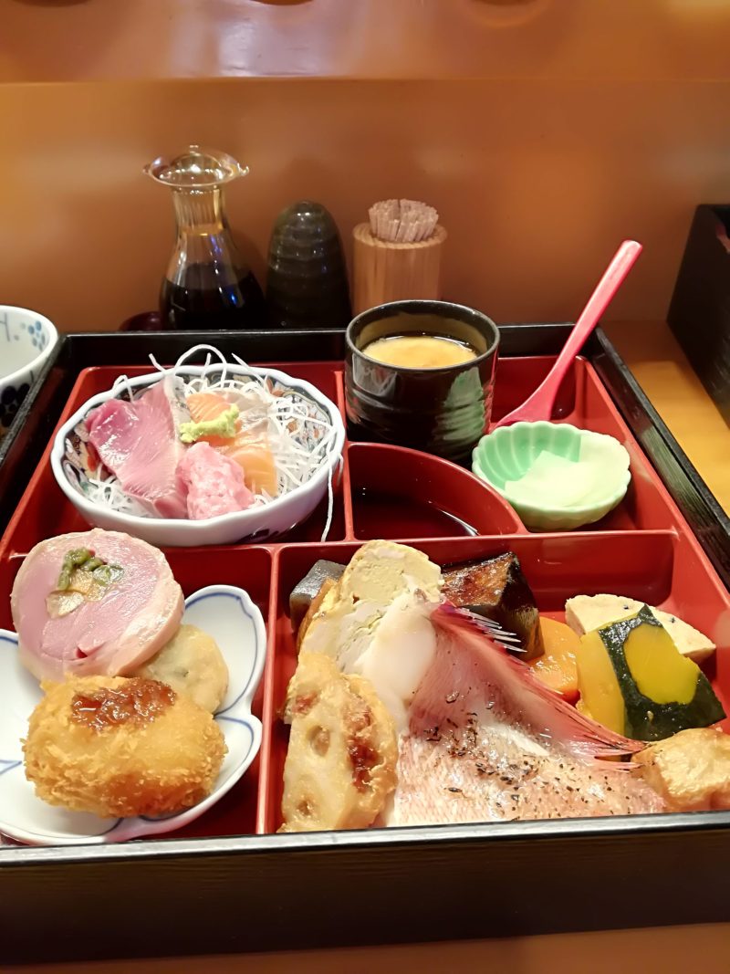 温かい食べ物は左下の揚げ物2つだけで魚や煮物が冷たかったのは残念かな~