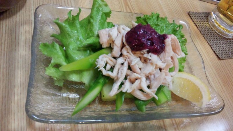 アスパラとチキンの梅肉和えです めっちゃカロリーなさそうなもの頼んじゃいました♪