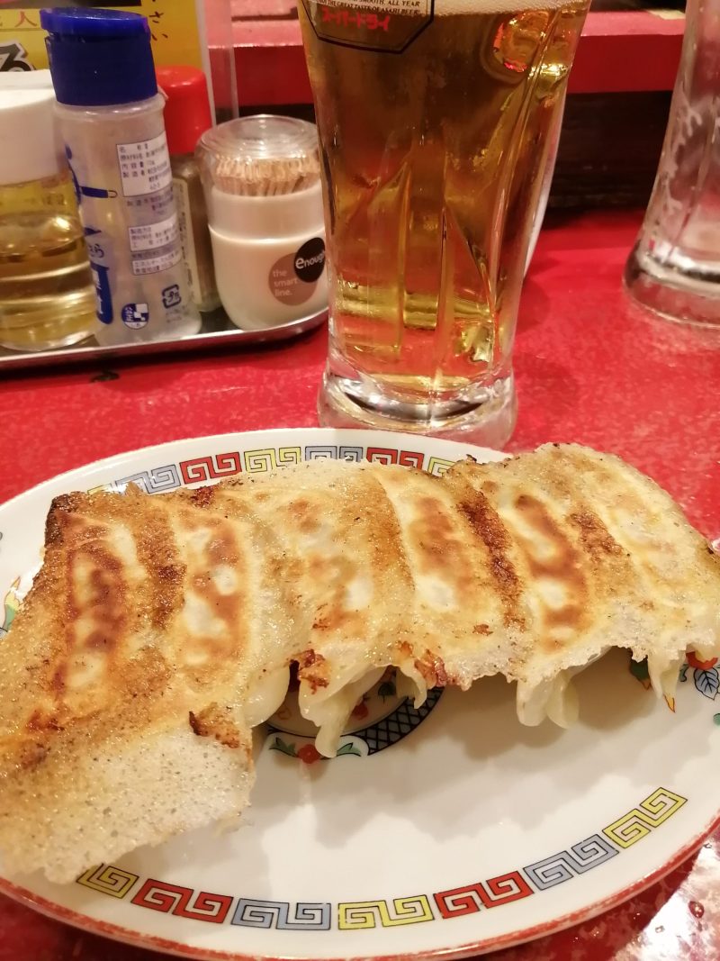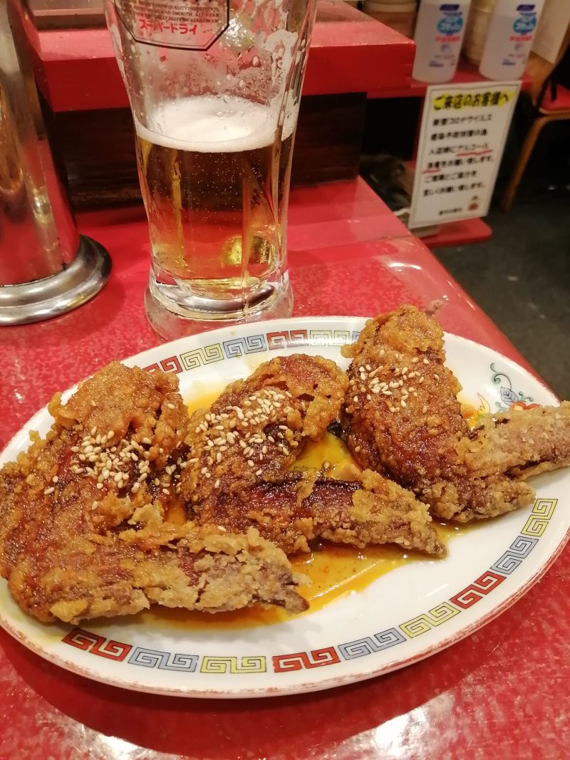 餃子と手羽先。最近手羽先を家で作ってあまりうまくいかなかったので外ならどうなのかな、と。世界の山ちゃんとはまったく別物ですが、これはこれで衣がガリガリで衣を食べると思えば美味しいです