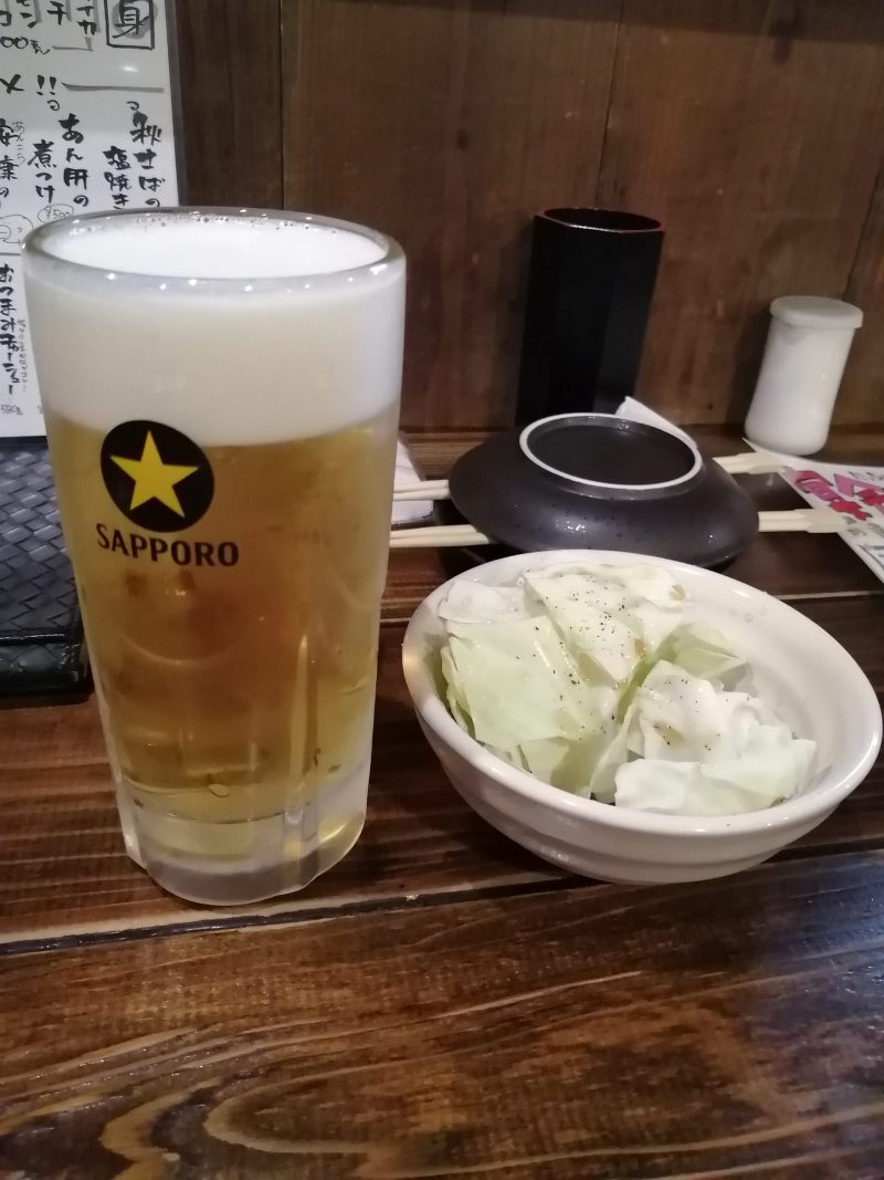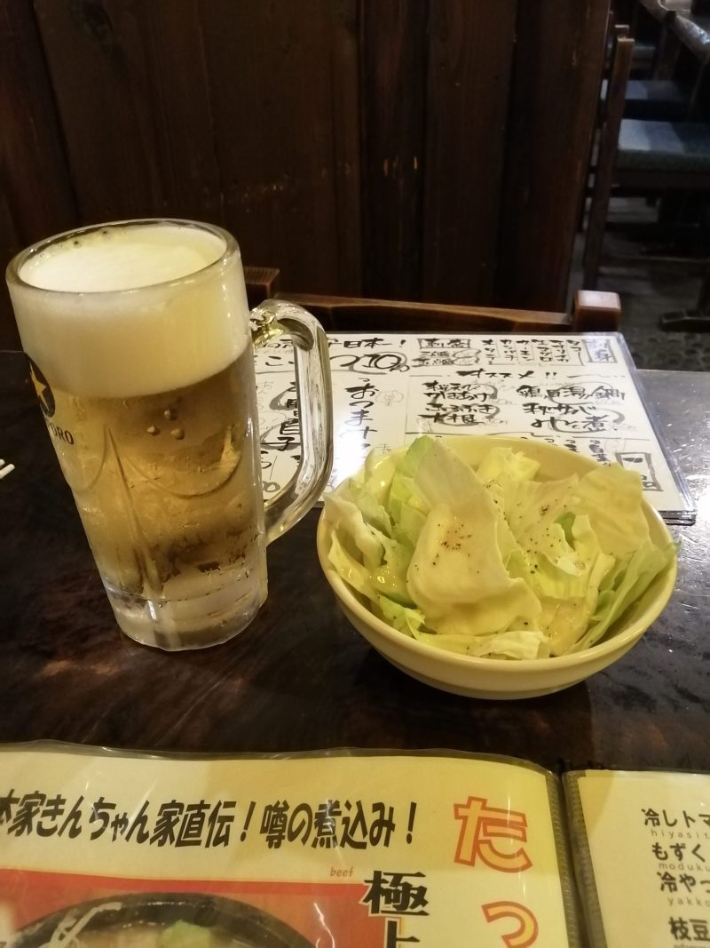 ビールとお通し。お通しキャベツは食べ放題だそうです