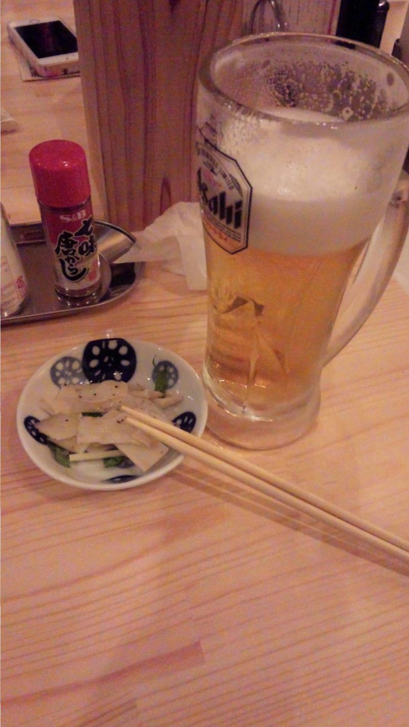 我慢できずに飲んじゃってますが、無料のビールとお通しです